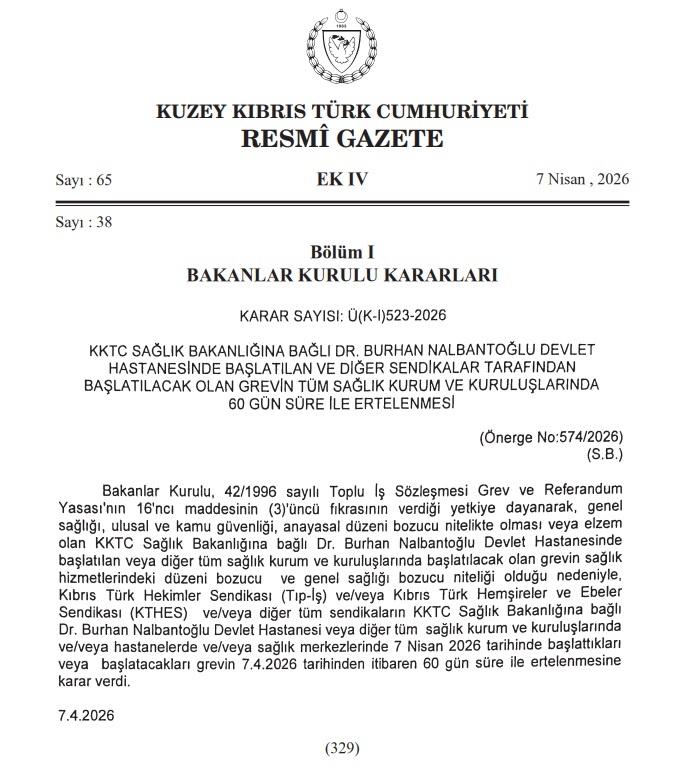 Karar kapsamında, Kıbrıs Türk Hekimler Sendikası (Tıp-İş), Kıbrıs Türk Hemşireler ve Ebeler Sendikası (KTHES) ve diğer sendikaların, Sağlık Bakanlığı’na bağlı tüm hastane ve sağlık merkezlerinde 7 Nisan 2026 itibarıyla başlattığı veya başlatacağı grevlerin, 7 Nisan 2026 tarihinden geçerli olmak üzere 60 gün süreyle durdurulmasına hükmedildi.