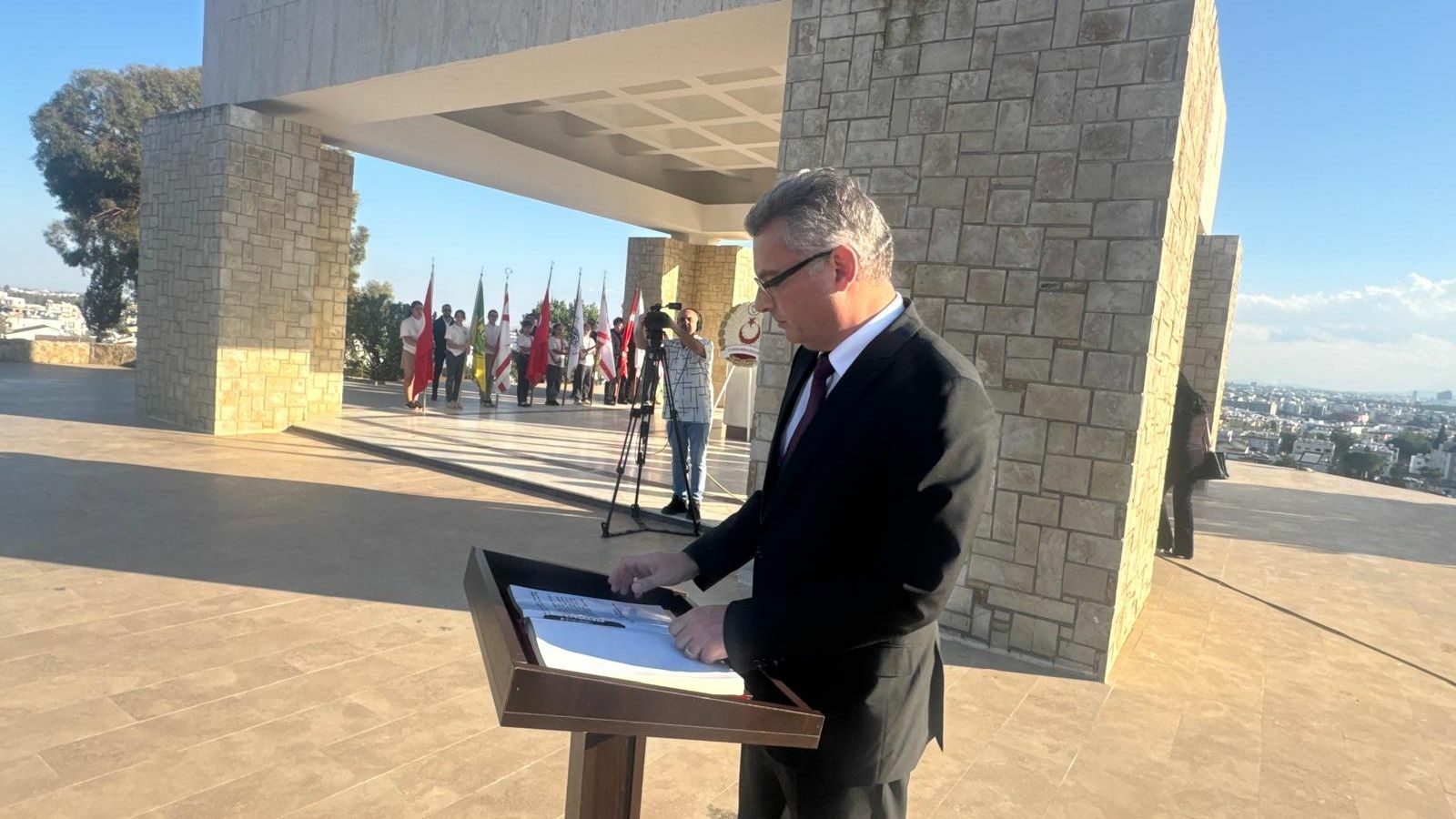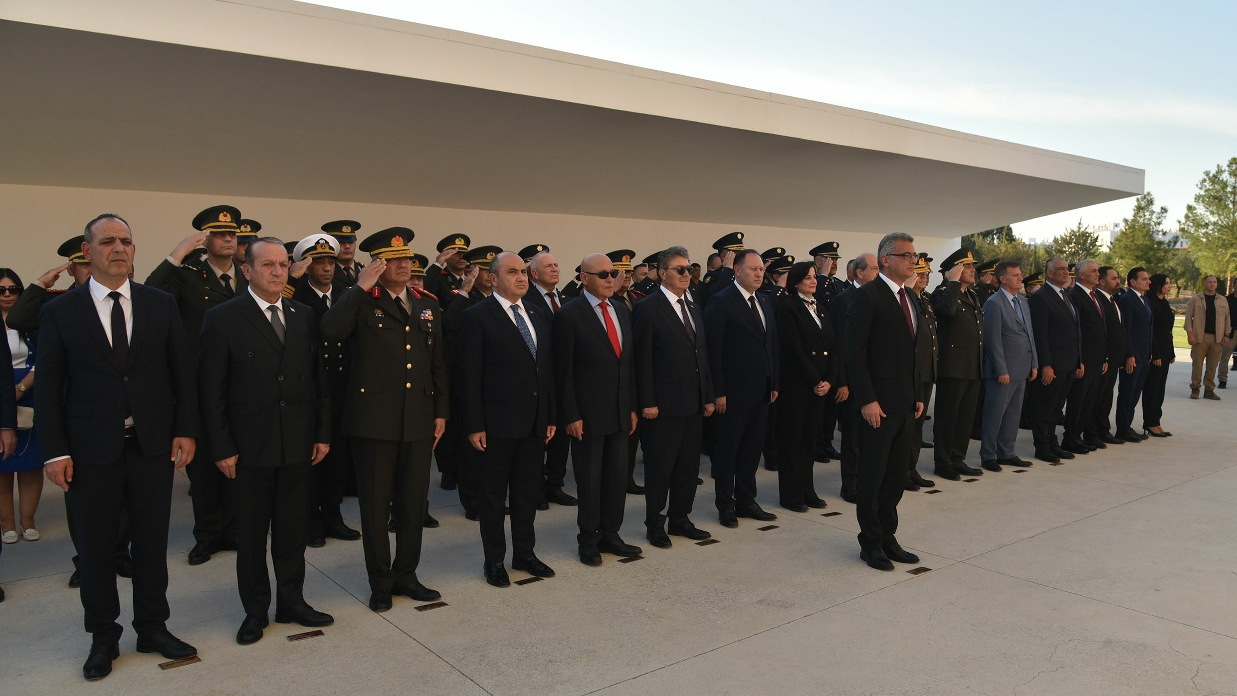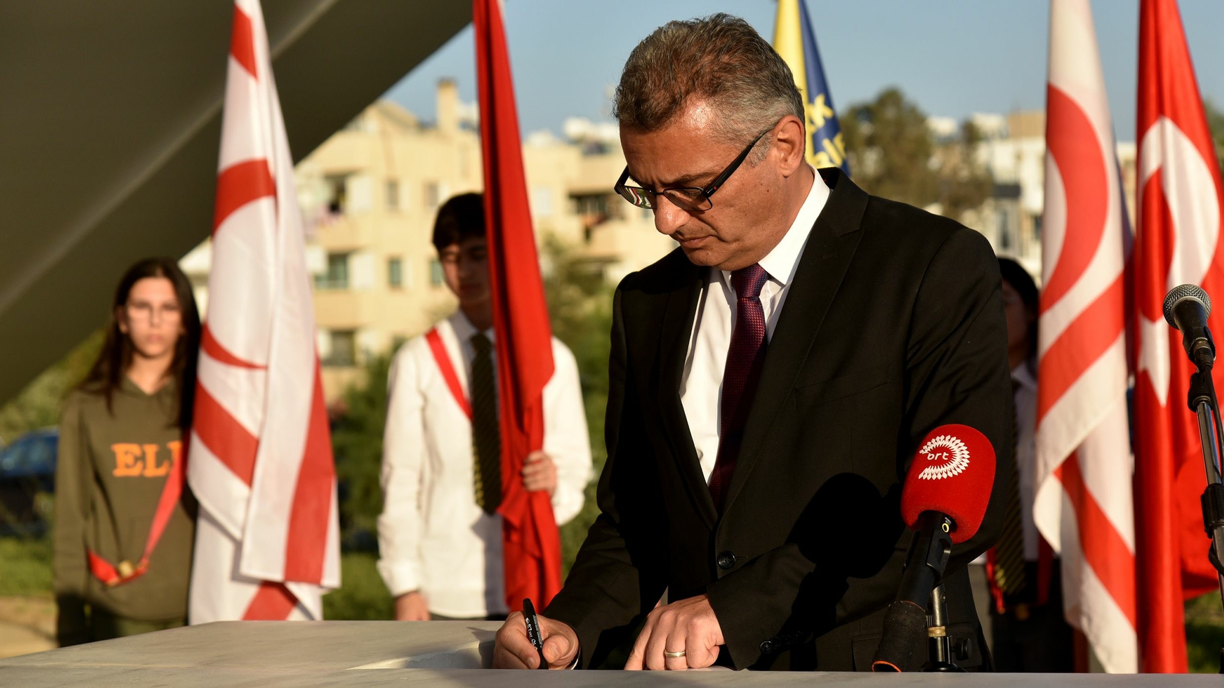 Anıta çelenk sunulmasıyla başlayan törende, saygı duruşu ve İstiklâl Marşı eşliğinde bayrakların göndere çekilmesinin ardından Cumhurbaşkanı Tufan Erhürman Anıt Özel Defteri imzaladı.