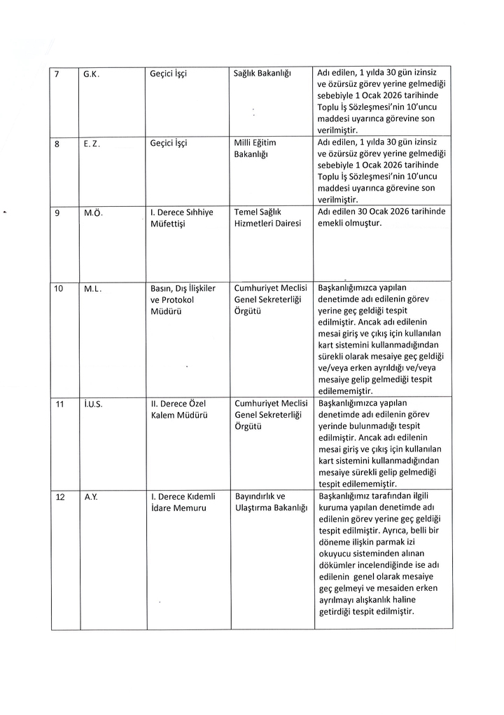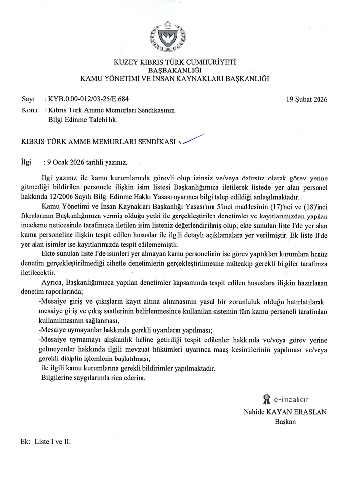 Kamu Yönetimi ve İnsan Kaynakları Başkanlığı'nın cevap yazısında, denetimler sonucu, mesaiye uymayanlara uyarı yapılması, bunu alışkanlık haline getirenlere ise maaş kesintisi ya da gerekli disiplin işlemi başlatılması amacıyla ilgili kurumlara bildirimler yapıldığı bilgisine yer verildi.