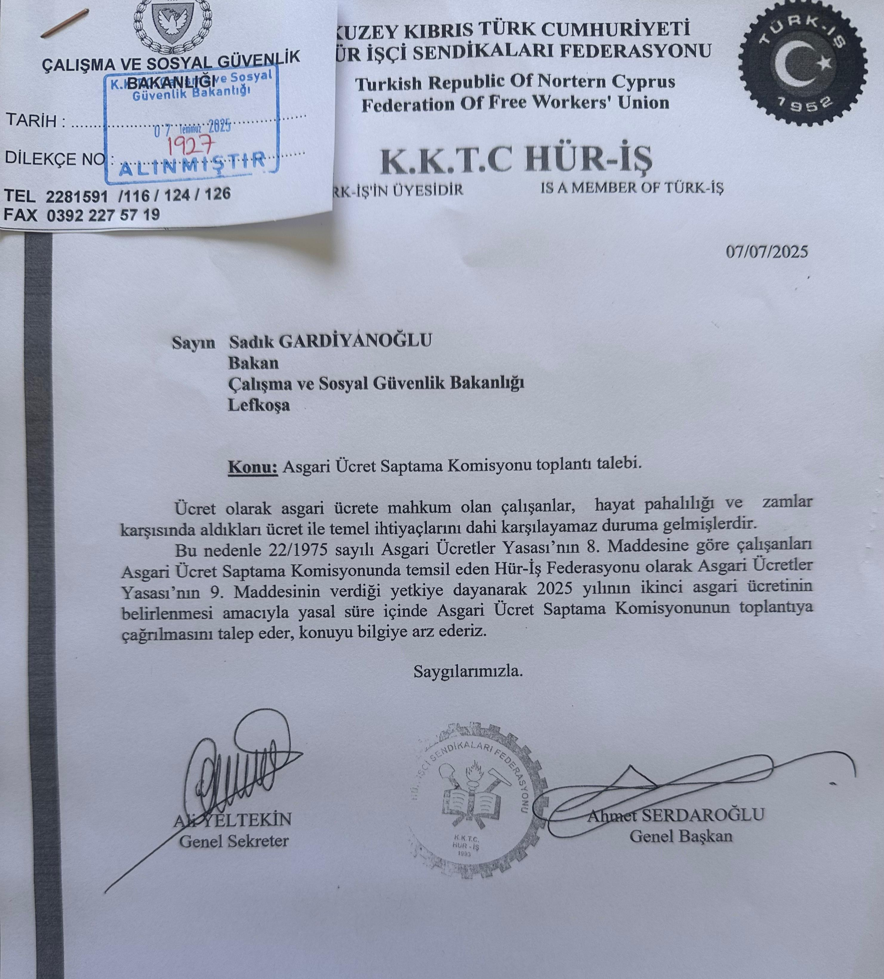 Hür İşçi Sendikaları (Hür-İş) Federasyonu Başkanı Ahmet Serdaroğlu, Asgari Ücret Saptama Komisyonu’nun toplanması için Çalışma ve Sosyal Güvenlik Bakanlığı'na resmi başvuruda bulunduklarını açıkladı.