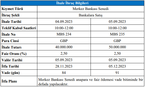 Merkez Bankası, sterlin cinsinden “Merkez Bankası Senedi” ihraç ihalesi açtığını duyurdu.