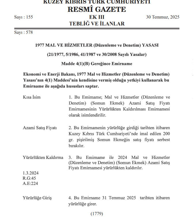 Ekonomi ve Enerji Bakanı Olgun Amcaoğlu, somun ekmekte tavan fiyat uygulamasını kaldırdı. 31 Temmuz 2025 itibarıyla 200 gramlık somun ekmeğin satış fiyatı serbest olacak.