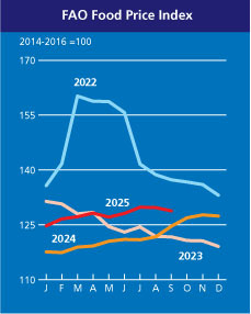 Gıda fiyat endeksi, Eylül 2024’e kıyasla Eylül 2025'te 4,2 puan ( yüzde 3,4) daha yüksek olmasına rağmen, Mart 2022’de ulaşılan zirvenin 31,4 puan (yüzde 19,6) altında kaldı.