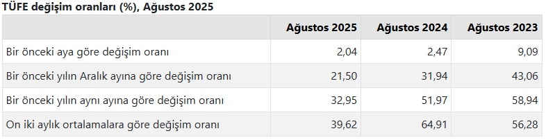 TÜİK'e göre Tüketici Fiyat Endeksi (TÜFE), ağustosta aylık bazda yüzde 2.04 arttı, yıllık bazda yüzde 32.95 olarak kayıtlara geçti.