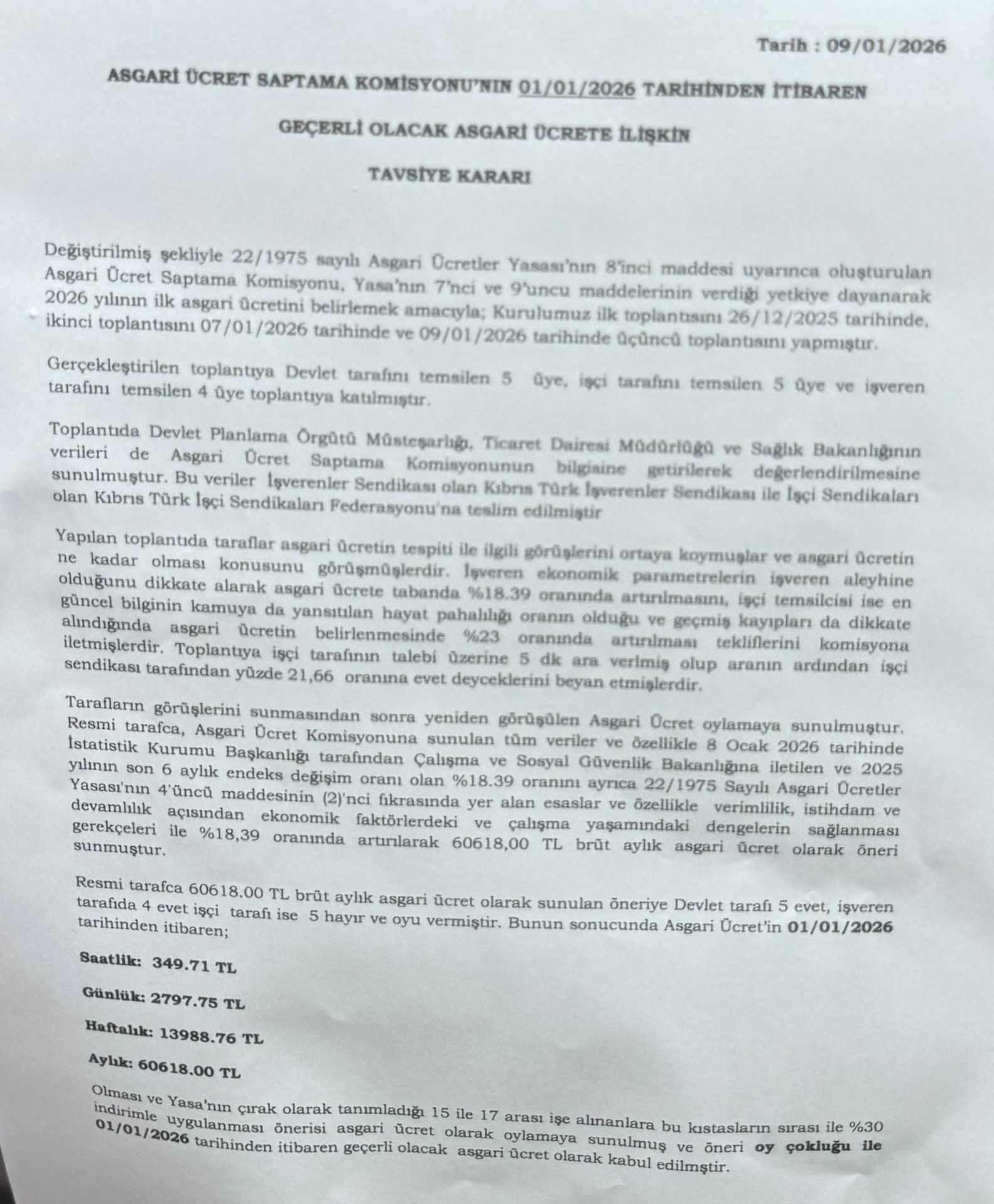 Asgari ücret, devlet ve işveren uzlaşısıyla yüzde 18.39 artışla, brüt 60 bin 618 TL, net 52 bin 738 TL oldu. İşçi kesimi komisyonun aldığı yeni asgari ücrete ilişkin tavsiye kararına itiraz edecek.