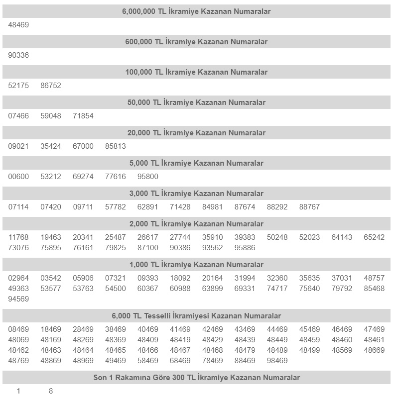 31 Aralık tarihinde gerçekleşecek olan bir sonraki çekilişte büyük ikramiye 8 Milyon TL olurken, toplam ikramiye 25 milyon 566 bin 750 TL olacak. Bilet fiyatının 400 TL olarak belirlendiği çekiliş biletleri Pazartesi gününden itibaren satışa sunulacak.