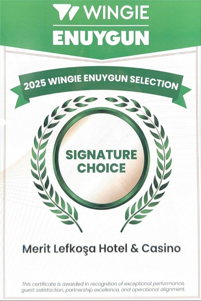 Kuzey Kıbrıs Türk Cumhuriyeti turizminin önemli temsilcilerinden Merit Lefkoşa Hotel & Casino, uluslararası seyahat platformu Wingie Enuygun tarafından verilen "2025 Wingie Enuygun Selection – Signature Choice" ödülünü kazandı.