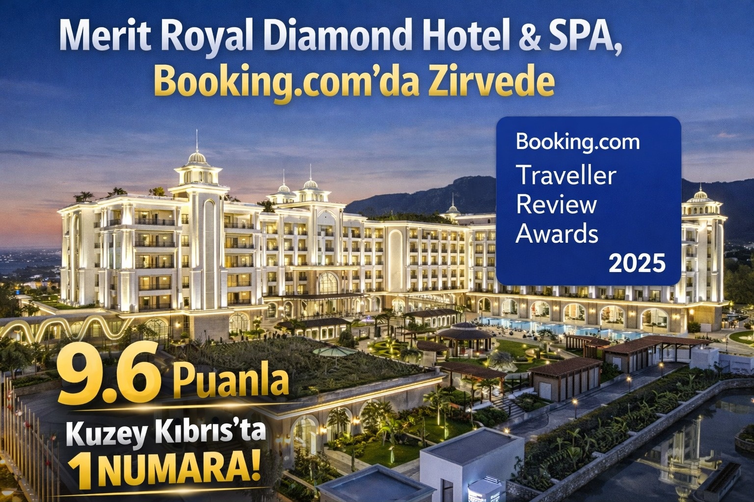 Merit Royal Diamond Hotel & SPA, Booking.com Traveller Review Awards’ta 9.6 puan alarak KKTC’de 1’inci oldu.