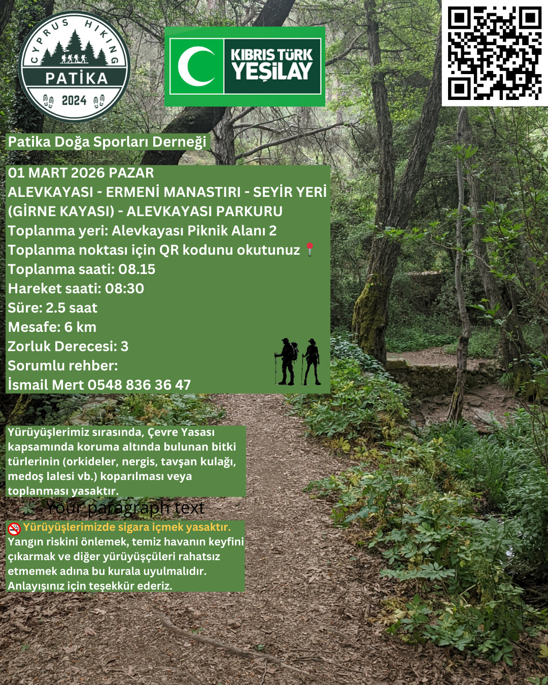 Patika Doğa Sporları Derneği ile Kıbrıs Türk Yeşilay Derneği iş birliğinde Yeşilay Haftası kapsamında, farkındalık yaratmak ve sağlıklı yaşamı teşvik etmek amacıyla 1 Mart Pazar günü doğa yürüyüşü düzenlenecek.